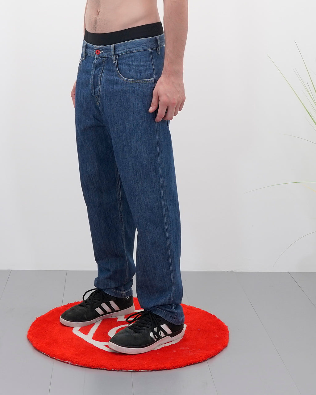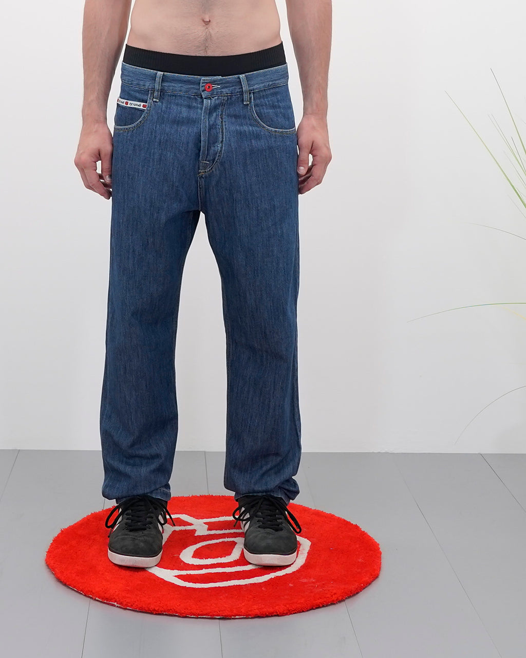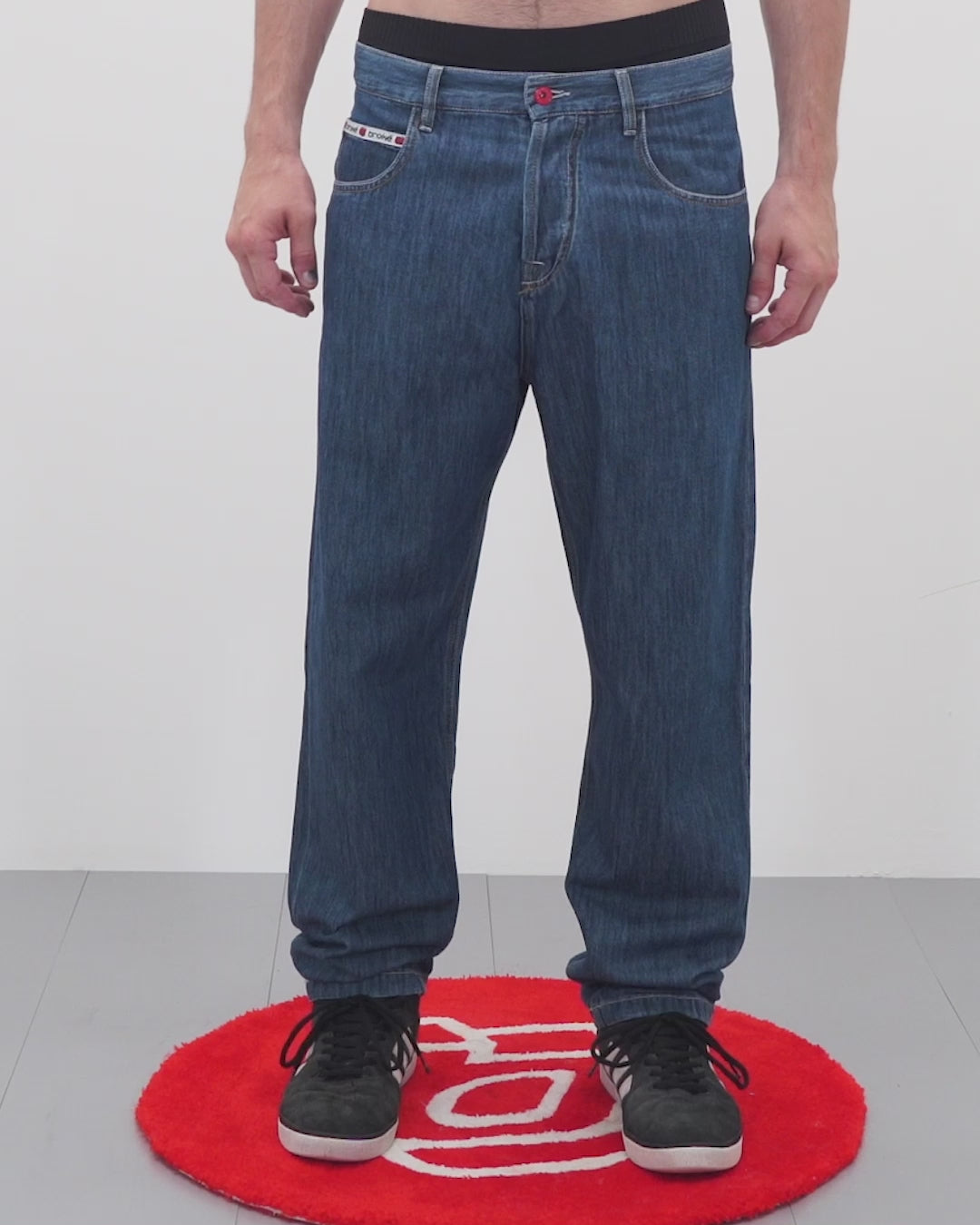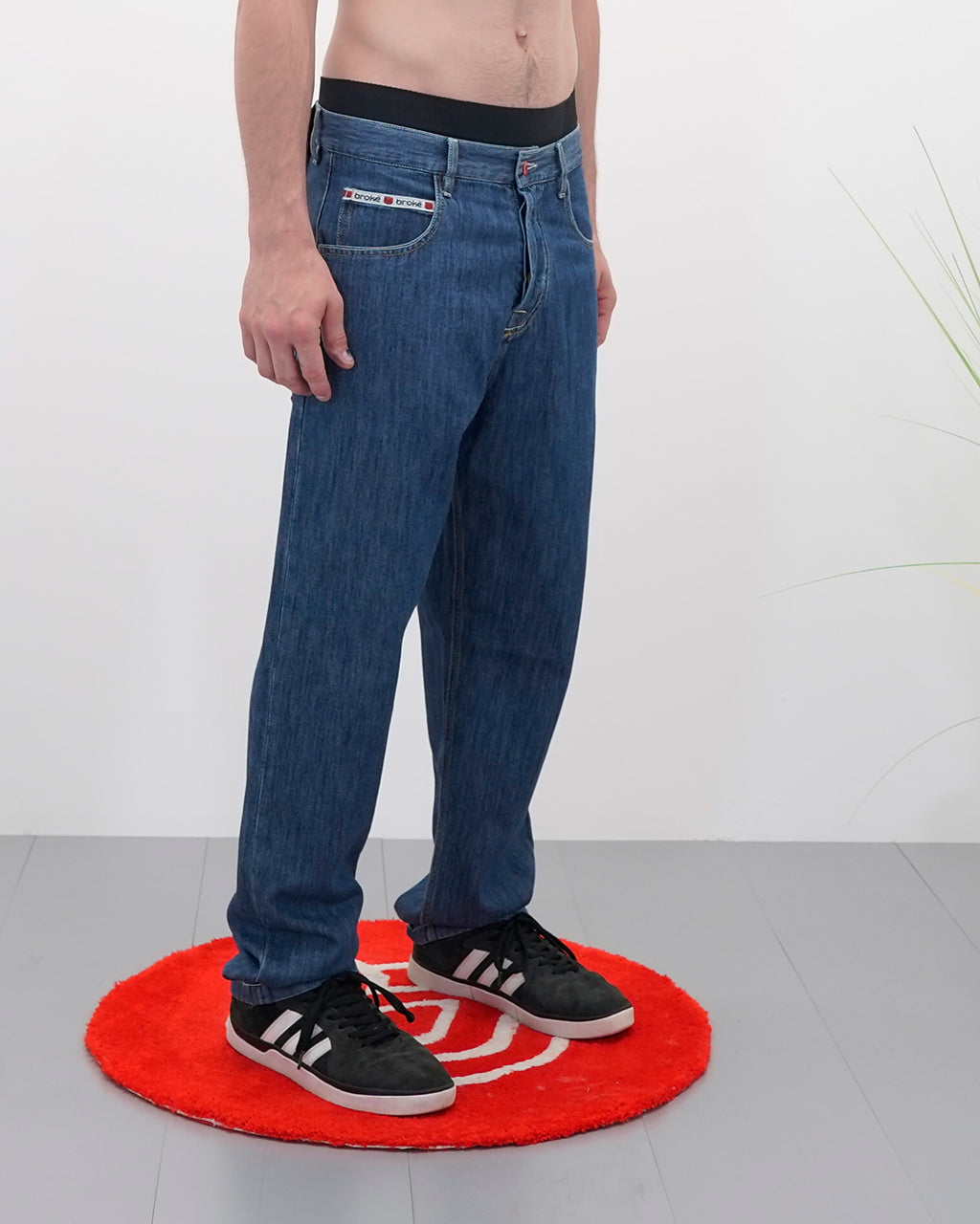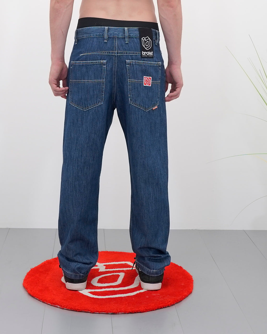 Bottoni personalizzati, salpa in denim nero e parasudore sul taschino anteriore; tasche posteriori decorate patch rossa del logo di Broke Clothing e carré disegnato con cuciture.